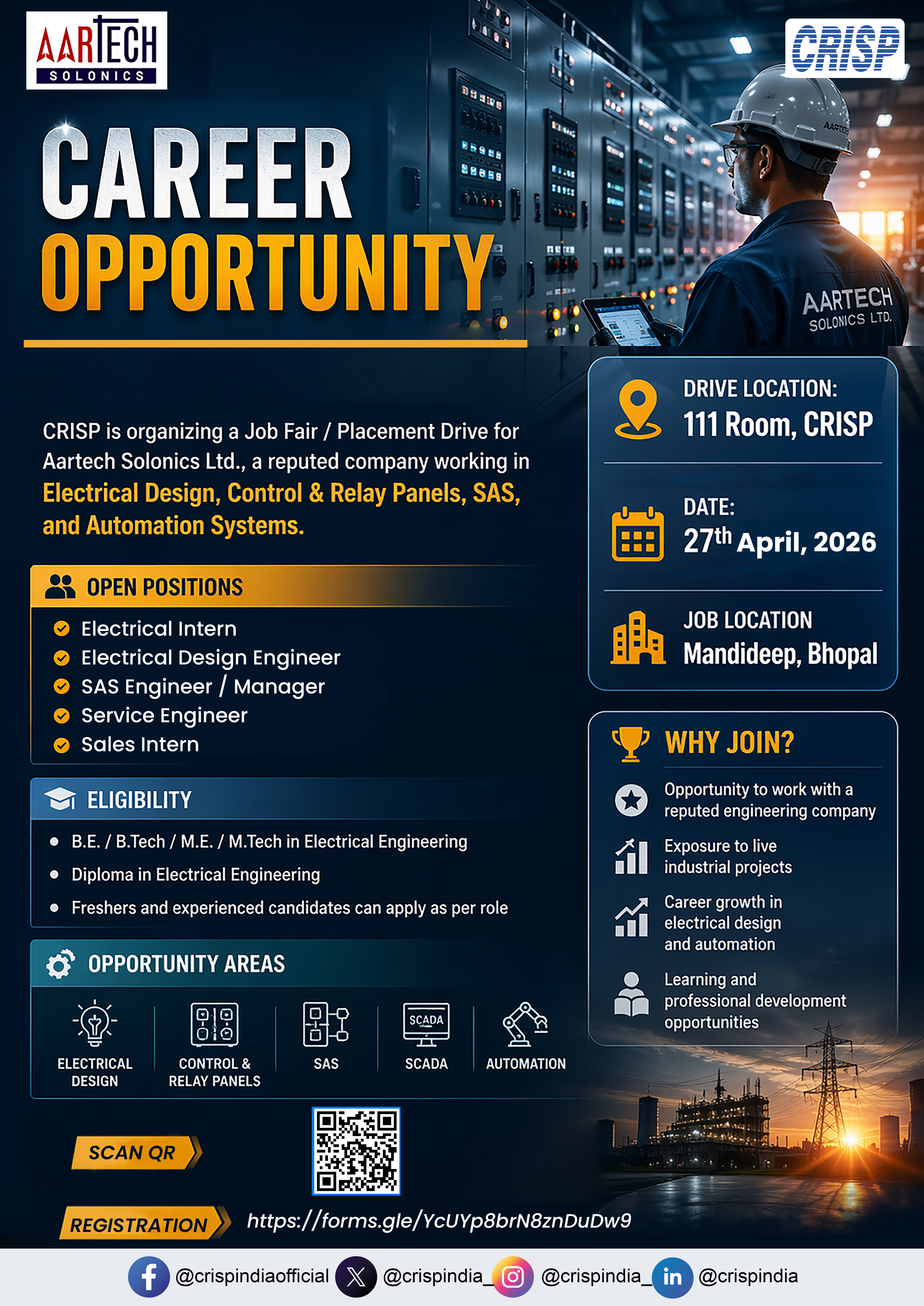 CRISP invites aspiring engineers to participate in an exclusive Job Fair / Placement Drive with Aartech Solonics Ltd., a leading name in Electrical Design, Control & Relay Panels, SAS, and Automation Systems.